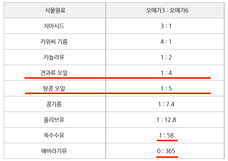 위에 표에서 확인해 보실 수 있드시, 해바라기유는 오메가3과 오메가6의 비율이 0:365로 오메가6의 함량이 엄청나게 높습니다. 식품을 고르실 때 참고하시면 좋으실 거 같습니다.