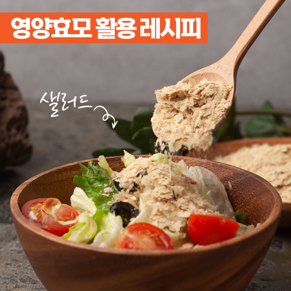 과일이나 야채 샐러드 위에 드레싱 소스 대신 영양효모를 토핑으로 뿌리면 칼로리는 줄이고, 풍미는 더욱 살아납니다.