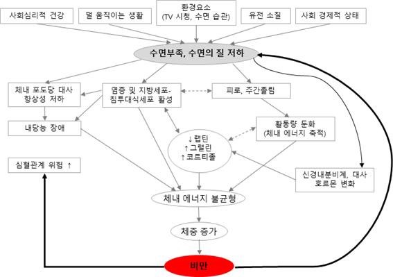 수면 부족이나 수면의 질 저하와 같은 수면장애가 있는 경우, 체내 염증 및 지방세포에 관여하는 대식세포의 활성을 초래하게 되는데, 이는 체내 포도당 대사에 영향을 미쳐 내당능 장애(체내 당 조절에 문제가 있는 경우, 예)당뇨)를 일으키거나 식욕조절 호르몬(랩틴, 그랠린)과 스트레스 호르몬(코르티졸)에 영양을 미쳐 비만을 야기합니다.